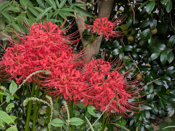 庭の秋の花。 気温が少し下がってきてバラの新芽も出始めました。 彼岸花、シュウメイギク、ランタナ。 赤勝て、白勝て、黄色は?! 秋の花が勢ぞろい。今週末は町民運動会です。