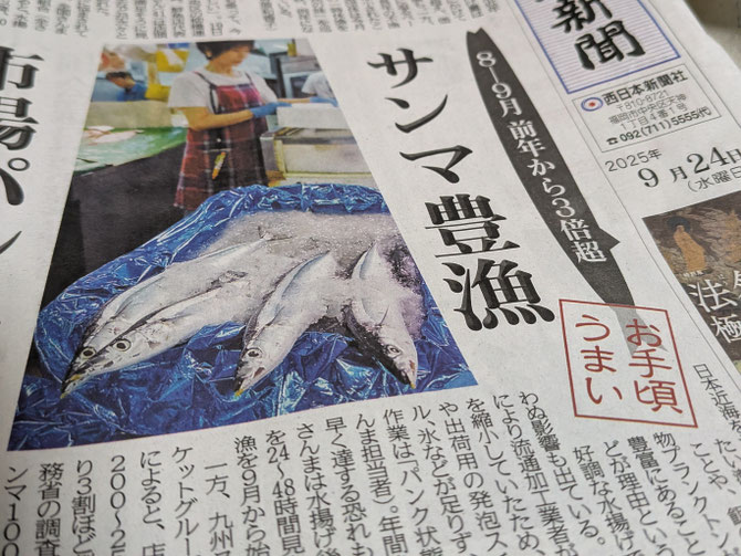 西日本新聞9月24日の記事です。豊漁で昨年よりも安いサンマ、とのことでした。 九州スーパーマーケットグループ担当者の話によると「大きくて脂の乗ったサンマが並ぶのは9月末まで。時季を逃さず食べてほしい」ということでした。 というわけで今日の晩ご飯のおかずはサンマの塩焼きと決めてスーパーへ。...